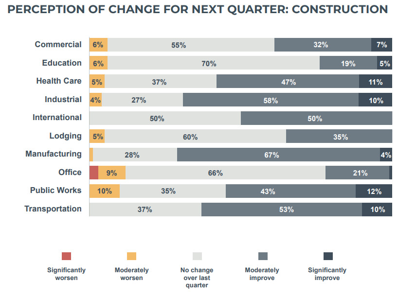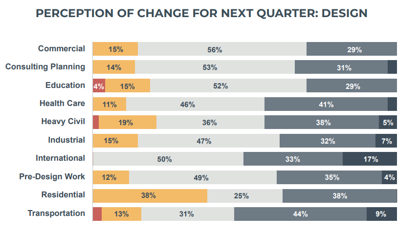 Positive outlook: Commercial, office, lodging, education, and healthcare sectors have seen improved sentiment. There’s also continued optimism in residential work, healthcare, education, predesign work, and consulting planning. Manufacturing, industrial, and transportation sectors show particular strength compared to the last quarter.